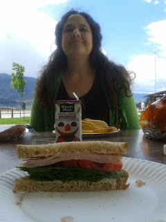 After a while we made sandwiches at a very nice Caltrans rest stop near Weed, Calif. (now that's a name!): turkey with fresh spinach and tomatoes. Yum!