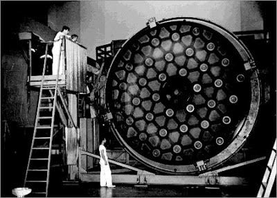 In the photo above, with throngs of people watching, a Pyrex telescope disc 200 inches in diameter, weighing 20 tons and made by the
